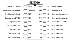 The EDE700 Serial LCD Interface IC is designed to conveniently control text-based LCD modules via a simple two or three wire link. This IC allows both engineer and hobbyist alike the ability to easily incorporate an LCD module into their design using a minimal amount of I/O lines. The EDE700 allows full LCD control, including the creation of custom characters. Also, the EDE700 is capable of scrolling text from the bottom row of a 2-row LCD to the top, in addition to the usual left-to-right scrolling feature built into most LCD modules. 2400/9600 Baud rate and selectable serial data polarity allow the EDE700 to communicate easily with most any serial device. Connection to almost any microcontroller, stamp, or microprocessor can be made using a single wire, without any type of voltage level conversion. Connection to a PC can be made using only a 33K Ohm resistor.