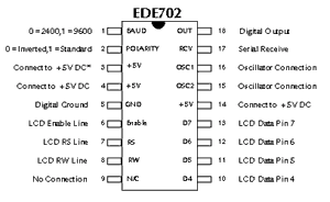 The EDE702 IC is designed to conveniently control text-based LCD modules via a simple two or three wire link. This IC allows both engineer and hobbyist alike the ability to easily incorporate an LCD module into their design using a minimal amount of I/O lines. The EDE702 allows full LCD control, including the creation of custom characters. The EDE702 is capable of utilizing the left-to-right scrolling feature built into most LCD modules, as well as offering a digital output pin for addition of an LED indicator, piezo beeper, etc.. 2400/9600 Baud rate and selectable serial data polarity allow the EDE702 to easily communicate with most any serial device. Connection to almost all microcontrollers, stamps, or microprocessor systems can be made using a single wire, without any type of voltage level conversion. Connection to a PC can be made using only a 33K Ohm resistor. Conection to microcontrollers requires only one pin, typically the UART ("universal asynchronous receiver/ transmitter", or serial port), or one digital I/O pin & a software UART in microcontrollers lacking a hardware UART (see microcontroller datasheet or contact us for additional details).